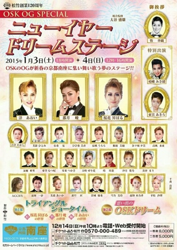 松竹創業120周年 OSK OG SPECIAL ニューイヤードリームステージ OSKのOGが 新春の京都南座に集い 舞い歌う夢のステージ 【ご挨拶】 牧 香織 【特別出演】 嵯峨 みさ緒 東雲 あきら 洋 あおい 那月 俊 桜花 昇ぼる 吉津 たかし 美影 ひとみ 有希 晃 ひび希 美香 汐風 うらら 相羽 美穂 奈ツ城 夕貴 高帆 未来 友麻 亜里 希望 なつ紀 安希 つかさ 大咲 せり花 萌 川菜 沙月 梨乃 美砂 まり ACCHY 波輝 一夢 美森 あいか 進堂 匠 貴城 優希 雪野 美鈴 森野 木乃香 平松 沙理 千爽 貴世 第1部 トライアングル ショータイム ●松: 桜花昇ぼるの世界 ●竹: 那月俊の世界 ●梅: 洋あおいの世界 第2部 想いでのOSKドリーム |