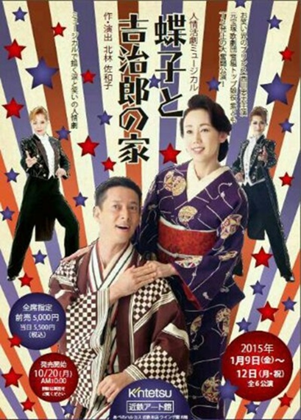 人情活劇ミュージカル 蝶子と吉次郎の家 【脚本・演出】北林佐和子 【演出・振付】伊瑳谷 門取 ●公演日時 2015年1月9日(金)〜 12日(月・祝) 全6公演 ●出演 西川忠志 よしもとクリエイティブエージェンシー 紫とも 元宝塚歌劇団 未央一 元宝塚歌劇団 風早優 元宝塚歌劇団 小久保びん 劇団GOCK LUCK HIROKA よしもとクリエイティブエージェンシー 田坂絵理 よしもとクリエイティブエージェンシー 〜〜〜〜〜〜〜〜〜〜 ★洋あおい…元OSK日本歌劇団(Wキャスト) ☆桜花昇ぼる…元OSK日本歌劇団(Wキャスト) 〜〜〜〜〜〜〜〜〜〜 お笑い界のプリンス:西川忠志主演 元宝塚歌劇団雪組トップ娘役:紫とも 丁々発止の大奮闘公演! 正月早々笑って泣いて、あーイソガシ。 昭和初期。大阪・道頓堀。 駆け落ちして夫婦になったワケありの蝶子と吉治郎の家には、 いつもワケありの珍妙な客がやってくる。 今日も今日とて自殺志願の女、思い込みの激しい 歌劇の男役大スター煌 光がやってきて… そしてこの家にはなんと貧乏神も棲みついていた… 歌と踊りで描く抱腹絶倒ロマンティックラブ ストーリー。 人生はバラエティショー 夫婦は愛を演じるコメディアン |