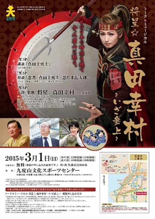 トーク&ミュージカル 「将星☆真田幸村」 〜いざ参上〜 400年の時空を経て 今、九度山に甦る。 <第1部> 講談「真田十勇士」 旭堂南陵(講談師) <第2部> 対談「忍者・真田十勇士・忍たま乱太郎」 北川央(大阪城天守閣館長) ×尼子騒兵衛(漫画家) <第3部> 太鼓×歌劇「将星☆真田幸村」in 九度山 ●作・演出 : 北林佐和子 ●監修 : 北川央 ●公演日時 2015年3月1日(日) [昼の部] 開場 11時 開演 12時 [夜の部] 開場 15時 開演 16時 ●出演 桜花昇ぼる(OSK日本歌劇団出身) 鳴海じゅん(宝塚歌劇団出身) 麻園みき(宝塚歌劇団出身) 洋あおい(OSK日本歌劇団出身) 波輝一夢(OSK日本歌劇団出身) 沙月梨乃(OSK日本歌劇団出身) 平松沙理(OSK日本歌劇団出身) 要冷蔵(劇団往来) 打打打団 天鼓 |