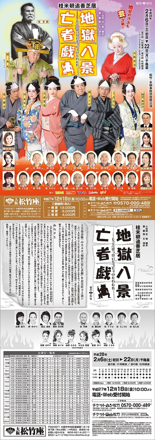 桂米朝追善芝居 地獄八景亡者戯 2015年(平成27年)3月19日、 惜しまれながら夜を去った 上方落語の巨星桂米朝。 関西だけでなく、芸能の世界に 大きな足跡を残した桂米朝の 一周忌を迎えるにあたり、 2016年2月、その面影を偲ぶ公演 として、米朝の代表演目の一つ 「地獄八景亡者戯」を舞台化。 米朝一門とお芝居でのゆかりの深い 大阪松竹座にて上演いたします。 芝居巧者ぞろいの米朝一門が、 落語の世界に登場し笑わせ、 泣かせてくれます。 この他、米朝ゆかりの出演者に よる芝居、華やかな歌、 踊りを交えながら、楽しく、 賑やかに米朝を偲びます。 ●出演 三林 京子 桂 南光 Vキャスト 桂 さこば 三倉 茉奈 ISSA(DA PUMP) 洋 あおい Wキャスト 桜花 昇ぼる Wキャスト 長江 健次 江口 直彌 里美 羽衣子 沙月 梨乃 美森 あいか 関口 まい DAICH(DA PUMP) YORI(DA PUMP) ほか 〜〜〜〜〜〜〜〜〜〜 江戸時代の大坂。祭礼で賑わう高津宮に来たのは、 売れないはなし家・泥丹坊堅丸。 なんとか売れたいと願っているのだが、なかなか 思うようにはいかない。 茶店で餅の大食い大会をやっているのに目をつけて、 「名前を知ってもらいためには」と参加する。 力士と対抗して餅を食べていると、ちょうど富くじの 抽選が始まり、一番くじを当てた医者が「当たった!」 と叫んだ声に驚いて、餅を喉につめて死んでしまう。 近所の軽業小屋で綱渡りをしていた軽業師も 医者の声に驚いて綱から墜落。 富を当てた医者もショック死してしまう。 この三人がやって来た冥途は、時代を超えた いろんな亡者たちが生き生き(?)と活躍している。 しょうづかの婆の営む茶店で、冥途の様子を教えて もらった三人は、ほかの亡者たちとともに渡し舟で 三途の川を渡る。 たどりついた閻魔の庁では、閻魔大王が 「一芸のある者は極楽へ通してやる」と言ったもの だから、時ならぬかくし芸大会が始まる。 日替わりゲストも飛び入り参加する芸比べの結果、 堅丸たちが行くのは地獄? 極楽? それとも…。 |