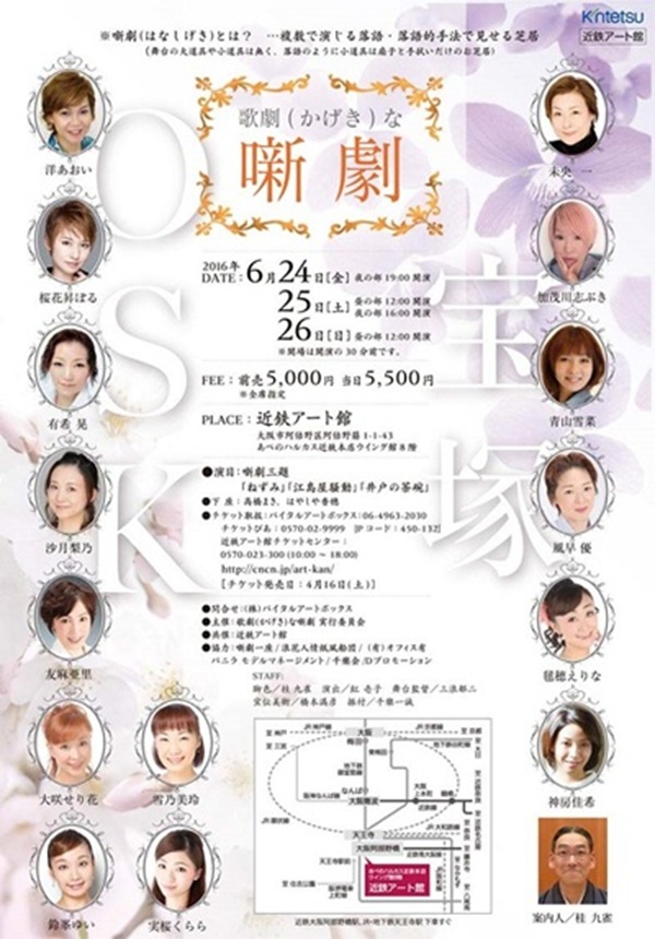 歌劇な噺劇U 艶やかな衣装も 華やかなスポットライトもない 歌劇スターたちのカゲキな挑戦 いざ、落語の世界へ ●演目 「ねずみ」 〜〜〜〜〜〜〜〜〜〜 落語では ★あらすじ 日本橋橘町の大工の棟梁、政五郎の家に 居候の身の左甚五郎。 見聞を広めるためか、ただの物見遊山か 奥州への旅へ出る。 仙台城下で客を引いている子どもに、 「おじさん、うちに泊まっておくれよ」 と袖を引かれて鼠屋という宿に入る。 使用人などはいなく腰の立たない卯兵衛 と十二になる子どもの卯之吉二人だけで やっている宿とは名ばかりで物置小屋 のような粗末な家だ。 足をすすぐのは裏の小川、夕飯は 父子二人分込みの出前の寿司、 布団は貸布団という宿らしからぬこと ばかりで、甚五郎が二分払うと卯之吉 は酒を買いに行った。 甚五郎 「なぜ、女中などを置かないのか?」 と、卯兵衛に問うと、 卯兵衛「もとは向かいの虎屋の主人でしたが、 五年前に女房を亡くしました。 古くからいる女中のお紺を後添えに いたしましたが、これが番頭の丑造と くっついて私をないがしろにし、卯之吉に つらく当たっていじめました。 ある時、二階の座敷で客同士の喧嘩の仲裁 に入ったところ、喧嘩の巻き添えを食って 階段から転がり落ちて、こんな身体に なってしまいました。 お紺と番頭は私たちが邪魔になり、 ここへ追いやりました。 ここは元は物置で、友達の生駒屋の計らい で宿を始めました。 ここは鼠が多いので鼠屋という名にしました」 話を聞き終えた甚五郎は、適当は木端を 持って二階に上がった。 卯兵衛が宿帳を見ると天下の彫り物師で びっくり仰天。 二階の甚五郎はその晩、精魂込めて一匹の 小さな鼠を彫り上げた。 翌朝、甚五郎は木の鼠を盥(たらい)に 入れて竹網をかけると、 ”左甚五郎作 福鼠 この鼠をご覧に なりたい方は、土地の人、旅の人を 問わずぜひ鼠屋にお泊りください” と書いた札を入口に揚げさせ、 「あるじ、卯之吉、世話になった」と 出発した。 すぐに通り掛かった近所の百姓が札に 気づく。 むろん甚五郎の名は百姓までにも 知れ渡っている。 早速、鼠を見せてもらうと、あな不思議、 盥の中の鼠がちょろちょろと動き回った。 びっくり仰天、さすがは甚五郎と感心だが、 家はすぐ近くだが鼠屋に泊まるハメになった。 さあ、この噂はすぐに広がって鼠を一目 見ようと、次から次へと見物人が押し寄せ、 それがみんな泊って行くから鼠屋は大繁盛。 裏の空き地に建て増し、使用人も何人も 置くようになった。 それに引き替え向かいの虎屋には悪い評判 が広がり、客足は遠のく一方で閑古鳥が 鳴く有り様だ。 困った丑造は仙台城下一の彫刻名人・ 飯田丹下に頼んで、大金を払って大きな 木の虎を彫ってもらって、二階に手摺り 置いて鼠を睨ませた。 大きな虎の威力に怯えたのか鼠はピタッと 動かなくなってしまった。 卯兵衛 「畜生、こんなことまでしやがっ て・・・」と、怒ったとたんに腰が 立った。 ずっと立たないと思って立とうと しなかったから立てなかっただけで、 立とうと思えばとっくに立てただけ なのだが。 卯兵衛は江戸に帰っている甚五郎に、 「おかげさまで私の腰が立ちましたが、 鼠の腰が抜けました・・・」と手紙を 送った。 どうしたのかと不思議に思った甚五郎は 二代目政五郎を連れて仙台へやって来た。 卯兵衛に言われて虎屋の二階を見ると 大きな虎がこっちを見ている。 甚五郎 「なあ、政五郎、あの虎をどう思う?」 政五郎 「金で作らされて魂が入ってない うつろな、卑しい目をしてまさぁ。 立派な虎は額に”王”という字が 浮かぶと言いやすが、あのトラには 何の風格もありゃしません。 ちっともいい虎とは思いやせん」」 甚五郎 「そうだろう。あたしもいい出来 とは見えない。 おい、ネズミ、俺はお前を彫る時に魂を 打ち込んで彫り上げたつもりだけど、 お前はあんな虎がそんなに恐いか」 鼠 「えっ?あれは虎ですか。 てっきり猫と思いました」 ……落語散歩519より 〜〜〜〜〜〜〜〜〜〜 「江島屋騒動」……略 「井戸の茶碗」……略 ●総踊り |