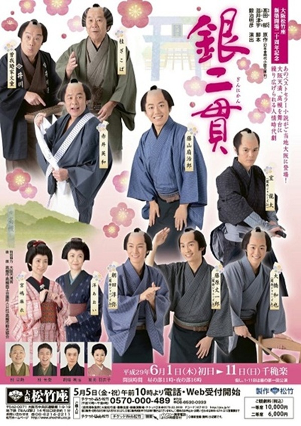 大阪松竹座 新築開場 二十周年記念 銀二貫 ●原作:高田 郁 ●脚本:滋井 津宙 ●演出:鍛冶 明彦 「みをつくし料理帖」シリーズ等で 人気の時代小説家、高田郁原作の 「銀ニ貫」は、 2009年に幻冬舎から刊行され、大阪の 書店員らが大阪ゆかりの小説の中から 「ほんまに読んでほしい」本を選ぶ 「Osaka Book One Project」の第1回 受賞作となった作品です。 〜〜〜〜〜〜〜〜〜〜 ●あらすじ 舞台は大坂天満。 寒天問屋・井川屋の主人和助は、偶然遭遇した 仇討で父を亡くした子・鶴之輔の命を「銀ニ貫」 で救う。 和助し助けられた鶴之輔は松吉と呼ばれ、 厳しい寒天場での修行を経て、井川屋で 丁稚として生きていくことに。 度重なる大火にも立ち上がる、義理と人情味 厚い大坂の商人たちとの出会いを通して成長 していく松吉。 そして新たな寒天を作り出すため高槻の 寒天場へ…。 始末・才覚・神信心を大事にする、大坂商人の 心意気と温かさを描く人情時代劇。 人と人との出会いと縁、ともに生きていくこと の尊さを伝える、大坂商人のものがたりに どうぞご期待ください。 |