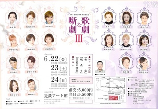 歌劇な噺劇V 艶やかな衣装も 華やかなスポットライトもない 歌劇スターたちのカゲキな挑戦 いざ、落語の世界へ ●演目 「転宅」 〜〜〜〜〜〜〜〜〜〜 落語では ★あらすじ 日本橋浜町の「黒板塀に見越しの松」 の妾宅。 50円渡して帰る旦那を、 お妾のお菊さんが見送りに出てきた。 これを見聞きしていた泥棒がその隙に 座敷に入り込み、残りの料理と酒を 飲み食いし始める。 そこへ戻ったお菊さんに泥棒は 「この段平物が目に入(へえ)れねえか」 と紋切り口上で、さっきの50円を出せ とおどす。 気丈で機転がきくお菊さん、あわてず 騒がず泥棒をおだて上げ、もとは 自分も仲間で、高橋お伝の孫で 「はんぺん」という名だなんて 泥棒をからかう余裕だ。 もう旦那には愛想が尽き、こんな 暮らしは飽き飽きしたから一緒に 逃げて夫婦になろうと持ち出す。 すっかり舞い上がった泥棒、 その気になって「今夜は泊ろう」ときた。 困ったお菊さん、「用心のため二階 は剣術と空手の先生に貸してある」と 切り抜け、あわてた泥棒を 「今はお湯に行っているから大丈夫」 と引き留め、 「今夜は帰って明日また来て頂戴、 三味線を弾くからその合図で家に入って」 と泥棒を説得する。 おまけに泥棒の紙入れから、 「亭主の物は女房の物」、 「女房の物は女房の物」なんて 丸め込んで80円も巻き上げる。 泥棒はつゆとも疑わず、じゃあ 明日と妾宅を出て行く。 翌日、待ちかねた泥棒さん、 意気揚々と妾宅にやって来るが、 雨戸が閉まっていて三味線の音も 聞こえない。 そこらを一回りして来るがやっぱり 同じだ。 向いの煙草屋で尋ねると、昨夜、 お菊さんの所へ間抜けな泥棒が 入ったという。 お菊さんは、色仕掛けでせまって 泥棒と夫婦約束までさせた。 すっかりのぼせ上がった間抜けな 泥棒は平屋なのに二階と言われても 気がつかない有様だったという。 泥棒が帰った後、さすがお菊さんも 怖くなってお店(たな)へ知らせ、 今朝早く店の若い者が来て荷物を まとめてご転宅、引っ越して行った。 そして町内の者はその間抜けな泥棒 が現れるのを今か今かと待っている という。 びっくら仰天、茫然自失の泥棒さん。 泥棒 「一体、あの女は何者です」 煙草屋 「もとは義太夫の師匠だったそうです」 泥棒 「道理でうまく語り(騙り)やがった」 ……落語散歩116より 〜〜〜〜〜〜〜〜〜〜 「硯売り」……略 「家島天神祭」……略 ●総踊り |