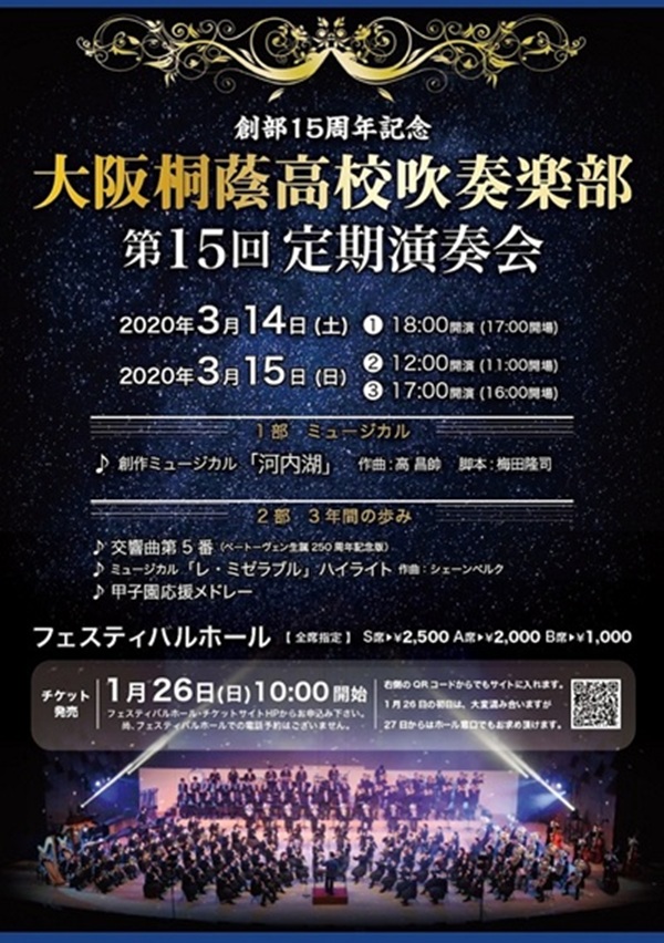 創部15周年記念 大阪桐蔭高等学校 吹奏楽部 第15回定期演奏会 ★★ 2/28新型コロナ ウィルス感染症 感染拡大防止に伴い、 公演中止。 ★★ |
