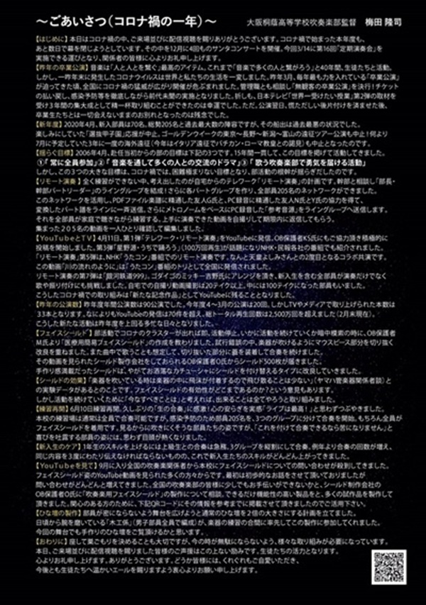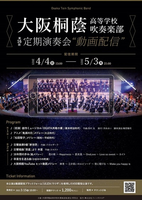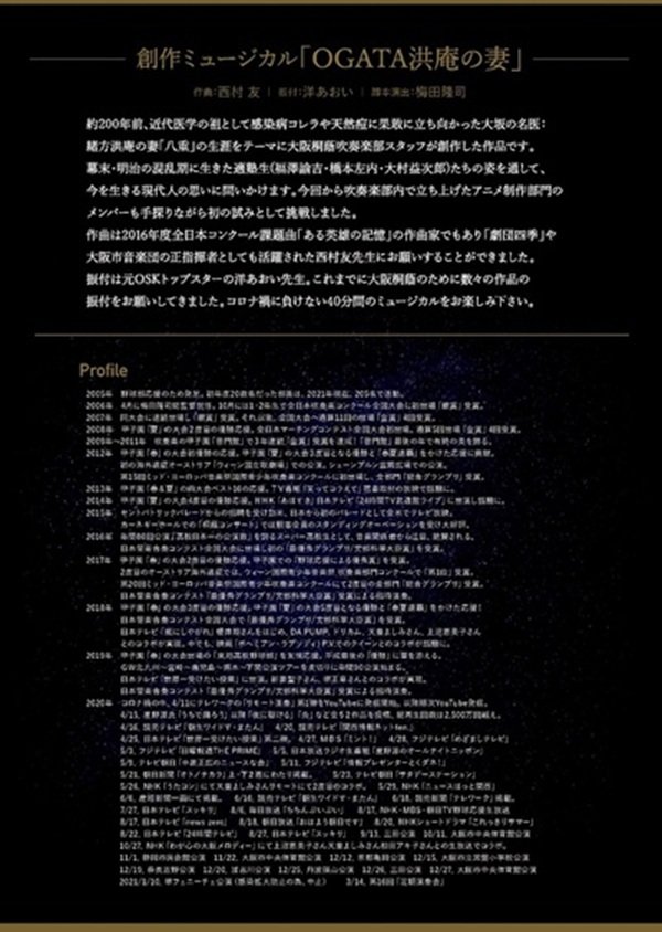 ★ フライヤー1掲載(原文のまま)。★ 大阪桐蔭高等学校 吹奏楽部 第16回定期演奏会 動画配信 配信期間:2021.04.04(日) 13時 〜 2021.05.03(月) 21時 Program 第1部 ♪(初演)創作ミュージカル「OGATA洪庵の妻」 (幕末明治時代) 作曲:西村友 振付:洋あおい 脚本演出:梅田隆司 ♪アニメ「鬼滅の刃」メドレー(大正時代) ♪「松田聖子」メドレー(昭和〜平成時代) 第2部 ♪交響曲第9番 「新世界」 作曲:ドボルザーク ♪交響組曲 「惑星」より木星 作曲:ホルスト ♪16年間の歩み(嵐メドレー) 君の歌〜Happiness〜 夏疾風〜OneLove〜 Love so sweet〜カイト ♪卒業生を送る曲(ひまわりの約束) ♪大阪桐蔭YouTubeヒット動画メドレー 群青〜泣き笑いのエピソード〜夜を駆ける〜 Make you happy 他 Ticket Information 本公演は動画配信プラットフォーム 「ULIZA(ウリザ)」を 使用したVOD配信公演です。 発売日:2021/03/15 10:00〜 視聴チケット:1,200円(税込) 販売:チケットぴあ 主催:大阪桐蔭高等学校 吹奏楽部後援会 桐音会 協力:株式会社ウインズスコア 〜〜〜〜〜〜〜〜〜〜 ★ フライヤー2掲載(原文のまま)。★ 創作ミュージカル 「OGATA洪庵の妻」 作曲:西村友 振付:洋あおい 脚本演出:梅田隆司 約200年前、近代医学の祖として感染症コレラや 天然痘に果敢に立ち向かった大坂の名医: 緒方洪庵の妻「八重」の生涯をテーマに大阪桐蔭 吹奏楽部スタッフが創作した作品です。 幕末・明治の混乱期に生きた適塾生(福沢諭吉・ 橋本佐内・大村益次郎)たちの姿を通して、 今を生きる現代人の思いを問いかけます。 今回から吹奏楽部内で立ち上げたアニメ制作 部門のメンバーも手探りながら初の試みとして 挑戦しました。 作曲は2016年度全日本コンクール課題曲「ある 英雄の記憶」の作曲家でもあり「劇団四季」や 大阪市音楽団の正指揮者としても活躍された 西村友先生にお願いすることができました。 振付は元OSKトップスターの洋あおい先生。 これまでに大阪桐蔭のために数々の作品の 振付をお願いしてきました。 コロナ禍に負けない40分間のミュージカルを お楽しみ下さい。 Profile 2005年 野球部応援のため発足。 初年度20数名だった部員は、 2021年度現在、205名で活動。 2006年 4月に梅田隆司総監督就任。 10月には1・2年生で 全日本吹奏楽コンクール 全国大会に初出場「銀賞」受賞。 2007年 同大会に連続出場し「銀賞」 受賞。それ以後、 全国大会へ通算11回の出場 「金賞」4回受賞。 2008年 甲子園「夏」の大会2度目の 優勝応援。 全日本マーチングコンテスト 全国大会初出場。 通算5回出場「金賞」4回受賞。 2009年〜2011年 吹奏楽の甲子園 「普門館で3年連続「金賞」 受賞を達成!「普門館」最後 の年で有終の美を飾る。 2012年 甲子園「春」大会初優勝の応援。 甲子園「夏」大会3度目となる優勝 と「春夏連覇」をかけた応援に貢献。 初の海外遠征オーストリア 「ウイーン国立劇場」での公演。 シェーンブルーン宮殿広場での公演。 第15回ミッド・ヨーロッパ音楽祭 国際青少年吹奏楽コンクールに 初出場し、全部門「総合グランプリ」 受賞。 2013年 甲子園「春&夏」両大会ベスト16 の応援。 TV番組「笑ってコラえて」密着 取材の放映で話題に。 2014年 甲子園「夏」の大会4度目の優勝 応援。 NHK「あほすき」日本テレビ 「24時間TV武道館ライブ」 に出演し話題に。 2015年 セントパトリックパレードからの招聘を 受け訪米、日本から初のパレード として全米でテレビ放映。 カーネーギーホールでの「桐蔭コンサート」では 観客全員のスタンディングオーベーションを 受け大好評。 2016年 年間80回公演「高校日本一の 公演数」を誇るスーパー高校生 として、音楽関係者から注目、 絶賛される。 日本管楽合奏コンテスト全国大会に 出場し初の「最優秀グランプリ/ 文部科学大臣賞」を受賞。 2017年 甲子園「春」大会2度目優勝応援。 甲子園での「野球応援による優秀賞」 を受賞。 2度目のオーストリア海外遠征では、 ウイーン国際青少年音楽祭吹奏楽部門 コンクールで「第1位」受賞。 第20回ミッド・ヨーロッパ音楽祭 国際青少年吹奏楽 コンクールにて2度目の全部門 「総合グランプリ」受賞。 日本管楽合奏コンテスト 「最優秀グランプリ/文部科学大臣賞」 受賞による招待演奏。 2018年 甲子園「春」の大会3度目優勝応援。 甲子園「夏」の大会5度目となる 優勝と「春夏連覇」をかけた応援! 日本管楽合奏コンテスト全国大会で 「最優秀グランプリ/文部科学大臣賞」 を受賞。 日本テレビ「嵐にしやがれ」 櫻井翔さんをはじめ、DA PUMP、 ドリカム、天童よしみさん、 上沼恵美子さんとのコラボが実現。 中でも、映画「ボヘミアン・ラプソディ」 P.V.でのクイーンとのコラボが話題に。 2019年 甲子園「春」の大会出場の 「東邦高校野球部」を友情応援。 平成最後の「優勝」に華を添える。 GW北九州〜宮崎〜鹿児島〜熊本〜 下関公演ツアーを皮切りに年間90 公演始まる。 日本テレビ「世界一受けたい授業」を 皮切りにに出演。新妻聖子さん、 堺正章さんとのコラボが実現。 日本管楽合奏コンテスト