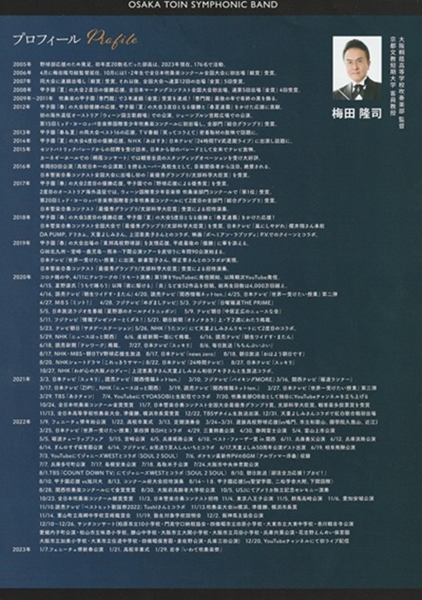 大阪桐蔭高校吹奏楽部 第18回 定期演奏会 日時 2023年3月12日 @開場11:00 開演12:00 A開場16:30 開演17:30 会場 フェスティバルホール ♪アルヴァマー序曲 ♪ラ・マンチャの男 ♪宇宙の音楽 ♪ウエスト・サイド・ストーリー ♪マイ・フェア・レディ ♪18年間の歩み ※ 洋 さんは振付指導で 参加されました。 〜〜〜〜〜〜〜〜〜〜 大阪桐蔭高等学校吹奏楽部プロフィール 2005年 野球部応援のため発足。初年度 20数名だった部員は、2023年現在、 176名で活動。 2006年 4月に梅田隆司総監督就任。 10月には1・2年生で全日本 吹奏楽コンクール全国大会 に初出場「銀賞」受賞。 2007年 同大会に連続出場「銀賞」受賞。 以後、全国大会へ通算12回の 出場「金賞」5回受賞。 2008年 甲子園「夏」の大会2度目の優勝 応援。全日本マーチングコンテスト 全国大会初出場。 通算5回出場「金賞」4回受賞。 2009年〜2011年 吹奏楽の甲子園 「普門館」で3年連続「金賞」受賞 を達成! 「普門館」最後の年で有終の美を 飾る。 2012年 甲子園「春」の大会初優勝応援。 甲子園「夏」の大会3度目となる 優勝と「春夏連覇」をかけた応援 に貢献。 初の海外遠征オーストリア 「ウィーン国立歌劇場」での公演。 シェーンブルン宮殿広場での公演。 第15回ミッド・ヨーロッパ音楽 祭国際青少年吹奏楽コンクール に初出場し、全部門「総合グラン プリ」受賞。 2013年 甲子園「春&夏」の両大会ベス ト16の応援。 TV番組「笑ってコラえて」密着 取材の放映で話題に。 2014年 甲子園「夏」の大会4度目の優勝 応援。 NHK「あほすき」 日本TV「24時間TV武道館ライブ」 出演し話題に。 2015年 セントパトリックパレードか らの招聘を受け訪米、日本から 初のパレードとして全米でテレ ビ放映。 カーネギーホール「桐蔭コン サート」では観客全員の スタンディングオベーションを 受け大好評。 2016年 年間80回公演「高校日本一の 公演数」を誇るスーパー高校生 として、音楽関係者から注目、 絶賛される。 日本管楽合奏コンテスト全国大 会に出場し初の「最優秀グランプリ /文部科学大臣賞」を受賞。 2017年 甲子園「春」の大会2度目の優勝 応援。甲子園での「野球応援に よる優秀賞」を受賞。 2度目のオーストリア海外遠征で は、ウィーン国際青少年音楽祭 吹奏楽部門コンクールで「第1位」 受賞。 第20回ミッド・ヨーロッパ音楽祭 国際青少年吹奏楽コンクールにて 2度目の全部門「総合グランプリ」受賞。 日本管楽合奏コンテスト「最優秀 グランプリ/文部科学大臣賞」 受賞による招待演奏。 2018年 甲子園「春」の大会3度目の優勝 応援。甲子園「夏」の大会5度目と なる優勝と「春夏連覇」をかけた 応援! 日本管楽合奏コンテスト全国大会 で「最優秀グランプリ/文部科学 大臣賞」を受賞。 日本TVTV「嵐にしやがれ」 桜井翔さん来校。 DA PUMP、ドリカム、天童よしみ さん、上沼恵美子さんとのコラボ。 映画「ボヘミアン・ラプソディ」 P.V.でのクイーンとコラボ。 2019年 甲子園「春」の大会出場の「東邦 高校野球部」友情応援。 平成最後の「優勝」に華を添える。 GW北九州〜宮崎〜鹿児島〜 熊本〜下関ツアーを皮切りに 年間90公演始まる。 日本TV「世界一受けたい授業」 に出演。 新妻聖子さん、堺正章さんとの コラボが実現。 日本管楽合奏コンテスト 「最優秀グランプリ/文部科学大臣賞」 受賞による招待演奏。 2020年 コロナ禍の中、4/11にテレワークの 「リモート演奏」第1弾をYouTubeに 発信開始。 以降順次YouTube発信。 4/15星野源氏「うちで踊ろう」 以降「夜に駆ける」「炎」など 全52作品を投稿、総再生回数は 4,000万回超え。 4/16読売TV「朝生ワイドす・またん」 4/20読売TV「関西情報ネットten.」 4/25日本TV「世界一受けたい 授業」第二弾 4/27MBS「ミント!」 4/28フジTV「めざましTV」 5/3フジTV「日曜報道THE PRIME」 5/5日本放送ラジオ生番組「星野源の オールナイトニッポン」 5/9TV朝日「中居正広のニュースな会」 5/11フジTV「情報プレゼンターとくダネ!」 5/21朝日新聞「オトノチカラ」 上・下2週にわたり掲載。 5/23TV朝日「サタデーステーション」 5/26NHK「うたコン」にて天童よしみ さんリモートにて2度目のコラボ 5/29NHK「ニュースほっと関西」 6/6産経新聞一面にて掲載 6/16読売TV「朝生ワイドす・またん」 6/18読売新聞「テレワーク」掲載 7/27日本TV「スッキリ」 8/6毎日放送「ちちんぷいぷい」 8/17NHK・MBS・朝日TV野球応援」 生放送 8/17日本TV「NEWS ZERO」 8/18朝日放送「おはよう朝日です」 8/20NHKショートドラマ「これっきりサマー」 8/22日本TV「24時間TV」 8/27日本TV「スッキリ」 10/27NHK「わが心の大阪メロディ」 上沼恵美子さん天童よしみ さん和田アキ子さんと生放送 コラボ。 2021年 3/3日本TV「スッキリ」、 売TV「関西情報ネットten.」 3/10フジTV「バイキングMORE」 3/16関西TV「報道ランナー」 3/17日本TV「ZIP!」、NHK 「ニュースほっと関西」 3/19読売TV「関西情報ネットten.」 3/27日本TV「世界一受けたい授業」 第三弾 3/29TBS「あさチャン」 7/4YouTubeにてYOASOBIと生配信 でコラボ 7/30吹奏楽部OB会とし