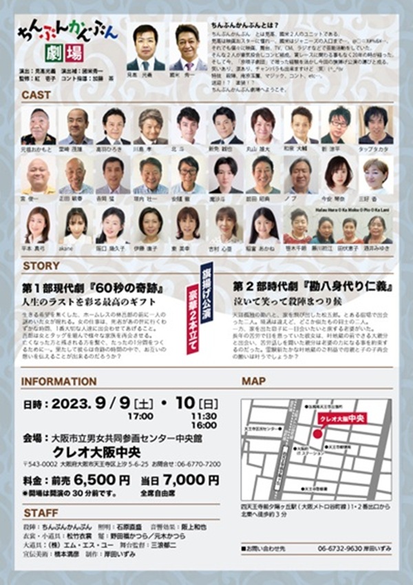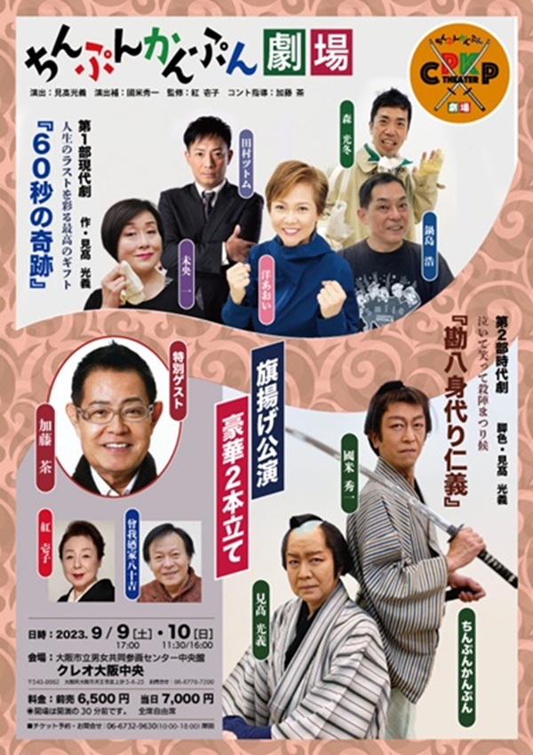 【日時】 2023年9月9日(土) 17時開演 10日(日) 11時半/16時開演 ※ 開場は開演の30分前です 【ちんぷんかんぷんとは?】 「ちんぷんかんぷん」とは 見高、國米2人のユニットである。 見高は映像(右)スターに憧れ…。 國米はジャニーズの入口まで…。 @○?I#%&\…。 それでも個々に映像、舞台、TV、CM、 ラジオなどで芸能活動をしていた。 そんな二人が意気投合しコンビ結成。 賞レースにかかわることもなく 20年に時が経った。 そして今、「京唄子劇団」で培った経験を 活かし今回の旗揚げ公演の運びと成る。 笑いあり、涙あり、チャンバラも 出来ますけど(笑) (^_^)v 特技 殺陣、南京玉簾、マジック、 コント、etc…。 送迎!? 塗装!? ちんぷんかんぷん劇場へようこそ。 【第一部 現在劇】 人生のラストを彩る最高のギフト 『60秒の軌跡』 【作・演出 】 見高光義 【演 出 補】 國米秀一 【監 修】 紅壱子 【コント監修】 加藤茶 【場所】 大阪市立男女共同参画センター中央館 クレオ大阪中央 (〒543-0002 大阪市天王寺区上汐5丁目6-25) 【料金】(税込、全席自由席) 前売6,500円 当日7,000円 〜〜〜〜〜〜〜〜〜〜 【第一部 現在劇】 人生のラストを彩る最高のギフト 『60秒の軌跡』 【作・演出 】 見高光義 【演 出 補】 國米秀一 【監 修】 紅壱子 【コント監修】 加藤茶 【あらすじ】 生きる希望を無くした、ホームレスの林吾郎の前に一人の 謎めいた女が現れる。 女の仕事は、死者があの世に行くわ ずかな時間、1番大切な人達に出会わせてあげること。 吾郎は女とタッグを組んで様々な家族と再会させる。 亡くなった方と残される方を繋ぐ、たった1分間をつく るために…。 果たして彼らは奇跡の期間の中で、お互いの 想いを伝えることが出来るのだろうか? 【出演】 森光冬 鍋島浩 田村ツトム 洋あおい 未央 一 【第二部 時代劇】 泣いて笑って殺陣まつり候 『勘八身代わり仁義』 【あらすじ】 天涯孤独の勘八と、家を飛び出した松五郎。とある宿場で出会 った二人。 境遇は違えど、どこか似たもの同士の二人。 一方、家を出た息子に一目会いたいと旅ずる老婆がいた。 長年の苦労で目を患っていた彼女は、叶地蔵の前でさる大親分 と出会い、苦労話を聞いた親分は老婆の力になる事を約束す るのだった。 霊験新たかな叶字憎悪ご利益で母親と子の再会 の願いは叶うでしょうか? 【出演】 國米秀一 見高光義 紅壱子 曾我廼家八十吉 特別ゲスト 「加藤茶」 |