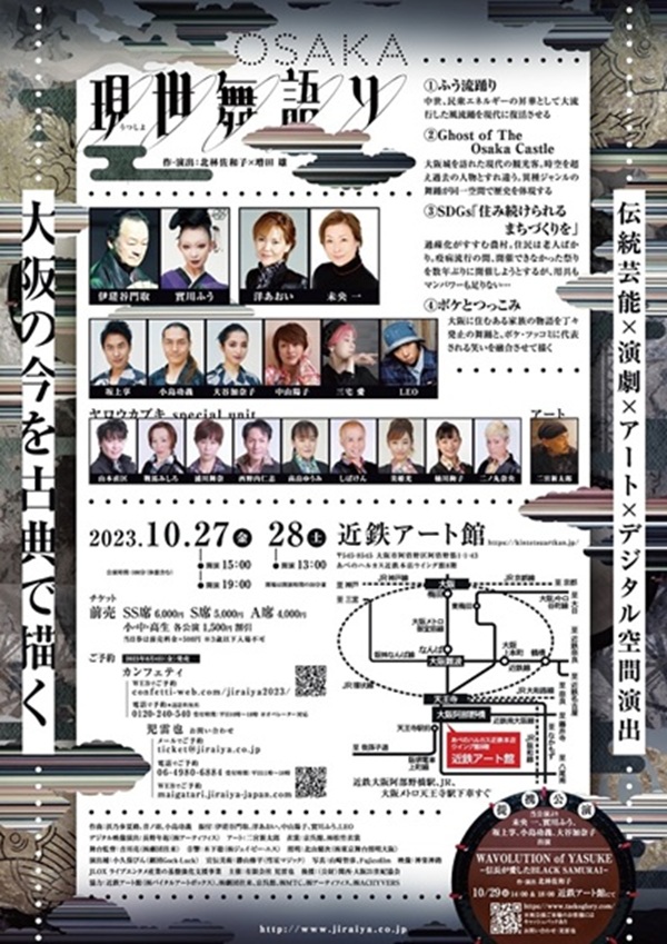 現世(うつしよ)舞語り ・伝統芸能をデジタル化すると こんな感じ ・大阪の今を古典で描く ・伝統芸能X演芸XアートX デジタル空間演出 【日時】 2023年10月27日(金) 15時/19時開演 28日(土) 13時開演 開場は開演の30分前です 【場所】 近鉄アート館 あべのハルカス近鉄本店 ウイング館8階 (大阪市阿倍野区阿倍野筋1-1-43) 【料金】(税込、全席指定) チケット前売:SS席 6,000円 S席 5,000円 A席 4,000円 小・中・高生 各公演1,500円割引 当日券は前売料金+500円 ※3歳以下入場不可 〜〜〜〜〜〜〜〜〜〜 『現世(うつしよ)舞語り』 【作・演出】 北林佐和子X増田 雄 @ふう流踊り 中世、民衆エネルギーの昇華として 大流行した風流踊を現在に復活させる AGhost of The Osaka Castle 大阪城を訪れた現在の観光客。 時空を超え過去の人物とすれ違う。 異種ジャンルの舞踊が同一空間で歴史 を体現する BSDGs「住み続けられるまちづくりを」 過疎化がすすむ農村。 住民は老人ばかり。 疫病流行の間、開催できなかった 祭りを数年ぶりに開催しようと するが、用具もマンパワーも足りない… Cボケとつっこみ 大阪に住むある家族の物語を丁々 発止の舞踊と、ボケ・ツッコミに 代表される笑いを融合させて描く 【出演】 伊嵯谷門取 實川ふう 洋あおい 未央 一 坂上享 小島功義 大谷加奈子 中山陽子 三宅愛 LEO ・ヤロオウカブキ spacial unit 山本直匡 鞍馬みしろ 浦川舞奈 西野内仁志 高畠ゆうみ しばけん 美姫光 川絢子 二ノ丸奈央 【アート】 二宮新太郎 【作曲】浜乃歩夏路、音ノ羽、小島功義 【振付】伊嵯谷門取、洋あおい、 中山陽子、實川ふう、LEO 【デジタル映像演出】長野年起(干ーティフィス) 【衣装】京呉館、鰹シ竹衣装 【宣伝美術】勝山修平(彗星マジック) 【写真】山崎智彦、Fujicofilm 【映像】神楽神路 JLOXライブエンタメ産業の 基盤強化支援事業 【主催】有限会社 児雷也 【後援】(公財)関西・大阪21世紀協会 【協力】近鉄アート館(缶゙イタルアートボックス)、 褐団往来、京呉館、凱TC、 干ーティフィス、晦CHYVERS ● 提携公演 ● WAVOLUTION of YASUKE ー信長が愛したBLACK SAMURAIー 【出演】 未央 一、實川ふう、坂上享、 小島功義、大谷加奈子 【作・演出】 北林佐和子 【日時】 10.19(日) 14時&18時 【場所】 近鉄アート館にて |
