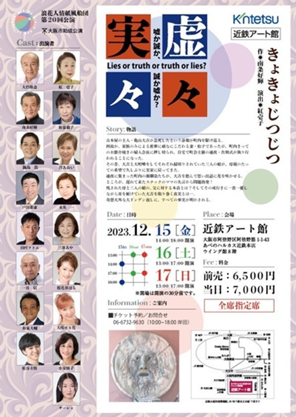 「きょきょじつじつ」虚々実々 作:南条好輝 演出:紅壱子 【日時】 2023年12月15日(金) 14時/18時開演 16日(土) 13時/17時開演 17日(日) 13時/17時開演 ※ 開場は開演の30分前です Cast:出演者 紅壱子 大竹修造 和泉敬子 南条好輝 洋あおい 鍋島浩 未央 一 戸田都康 三原あや 田村ツトム 桜花昇ぼる 一谷 信 大咲せり花 和泉大輔 小安展子 松谷圭悟 サーシャ 【場所】 近鉄アート館 あべのハルカス近鉄本店 ウイング館8階 (大阪市阿倍野区阿倍野筋1-1-43) 【料金】(税込、全席自由席) 前売6,500円 当日7,000円 〜〜〜〜〜〜〜〜〜〜 Story:物語 古本屋の主人・亀山大吉が急死してという訃報が町内を駆け 巡る。 何故か、家族のみによる密葬を頑なにこだわる妻・松子で あったが、町内きってのお節介焼きの婦人会長に押し切ら れ、自宅で町会主催の通夜・告別式が執り行われることに なった。 その昔、大吉と大喧嘩をしてそれぞれ縁切りされていた三人 の娘が母親のたっての希望で久しぶりに実家に戻ってきた. 通夜に集まった町内の顔馴染たちが、大吉を偲んで思い出話 に花を咲かせる。 ところが、遅れて来たスナックのママの失言から問題勃発? 残された母と三人の娘の、父に対する本音とは? そしてその成り行きに一喜一憂しながら耳を傾けていた大吉 を取り巻く真実とは… 奇想天外な大ドンデン返しに、すべての事実が明かされる。 |