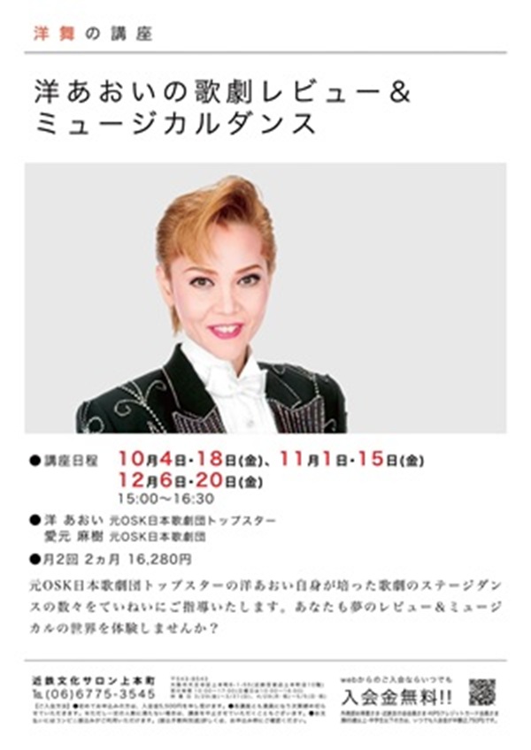 洋あおい の 歌劇レビュー& ミュージカルダンス 元OSKトップスターの洋あおい自身が培った歌劇のステージ ダンスの数々を丁寧にご指導いたします。 あなたも夢のレビュー&ミュージカルの世界を体験しませんか? (近鉄文化サロン上本町のHPより転載) 【講座日程】 5月17日(金)・31日(金) 6月 7日(金)・21日(金) 7月 5日(金)・19日(金) 8月 2日(金)・16日(金) 9月 6日(金)・20日(金) 10月 4日(金)・18日(金) 11月 1日(金)・15日(金) 12月 6日(金)・20日(金) 15:00〜16:30 月2回2ヶ月 16,280円 詳しくは、 近鉄文化サロン HPでご確認ください。 ※ 当講座の前半で、「健康な身体を保つための免疫力アップスペシャル トレーニング」を行います。 そのため、一部、時間が重複しています。 〜〜〜〜〜〜〜〜〜〜 |