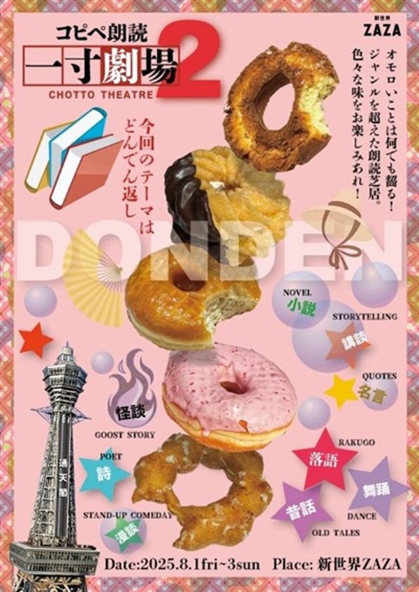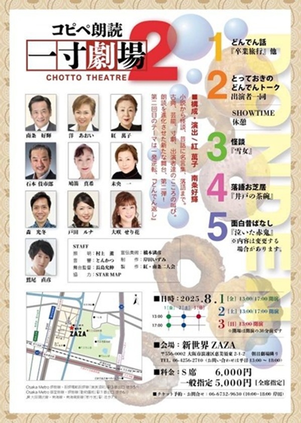 コピペ朗読 一丁劇場2 CHOTTOTHEATRE 今回のテーマは どんでん返し オモロいことは何でも齧る! ジャンルを超えた朗読芝居。 色々な味をお楽しみあれ! ・NOVEL 小説 ・STORYTELLING 講談 ・QUOTES 名言 ・RAKUGO 落語 ・DANCE 舞踊 ・OLD TALES 昔話 ・GOOST STORY 怪談 ・POET 詩 ・STAND-UP COMEDAY 漫談 構成・演出/紅 萬子 南条好輝 小説から怪談、昔話に名言集、落語まで。 古典芸能寸劇出演者達のこころの叫び。 朗読を進化させた新たな舞台、第二弾! 第二回目のテーマは一発逆転、 『どんでん返し』 1.どんでん話『卒業旅行』他 2.とっておきのどんでんトーク出演者一同 SHOWTIME 休憩 3.怪談『雪女』 4.落語お芝居『井戸の茶碗』 5.面白昔ばなし『泣いた赤鬼』 ※内容は変更する 場合があります。 〜〜〜〜〜〜〜〜〜〜 − 出演 − 南条好輝 洋あおい 紅萬子 石本伎市郎 鳩笛真希 未央 一 森光冬 戸田ルナ 大咲せり花 鷲尾直彦 |