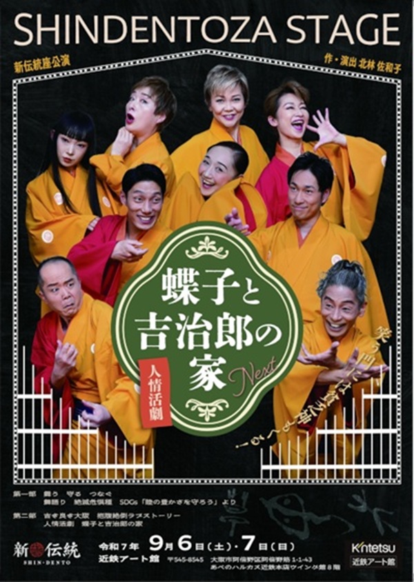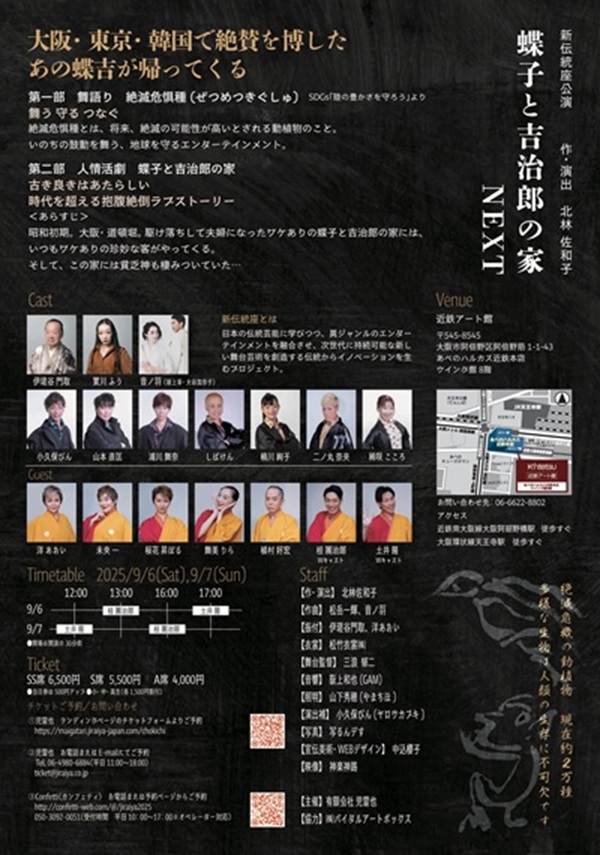 日本の伝統芸能に学びつつ、異ジャンル のエンターテインメントを融合させ、 次世代に持続可能な新しい舞台芸術 を創造する伝統からイノベーション を生むプロジェクト。 第一部 舞う 守る つなぐ 舞語り 絶滅危惧種 SDG'S「陸の豊かさを守ろう」より 第二部 古き良き大阪 抱腹絶倒ラブストーリー 人情活劇 蝶子と吉次郎の家 【 蝶子と吉次郎の家 】 笑う門には貧乏神もくる! 作・演出 北林 佐和子 Cast 伊瑳谷門取 實川ふう 音ノ羽(坂上亨・大谷加奈子) Guest 洋あおい 未央一 桜花昇ぼる 舞美りら 植村好宏 桂團治郎 土井隆 Staff 【作・演出】北林佐和子 【作曲】松岳一輝、音ノ羽 【振付】伊瑳谷門取、洋あおい 【衣裳】松竹衣裳(株) 【舞台監督】三浪侑二 【音響】阪上和也(GAM) 【照明】山下秀穂(やまちほ) 【演出補】小久保びん(ヤロウカブキ) 【写真】写るんデす 【宣伝美術・WEBデザイン】中込櫻子 【映像】神楽神路 【主催】有限会社児雷也 【協力】(株)バイタルアートボックス 〜〜〜〜〜〜〜〜〜〜 第一部 舞語り 絶滅危惧種(ぜつめつきぐしゅ) SDGs「陸の豊かさを守ろう」より 舞う 守る つなぐ 絶滅危惧種とは、将来、絶滅の可能性が 高いとされる動植物のこと。 いのちの鼓動を舞う、地球を守る エンターテインメント。 第二部 人情活劇「蝶子と吉治郎の家」 古き良きはあたらしい 時代を超える抱腹絶倒ラブストーリー <あらすじ> 昭和初期。大阪・道頓堀。 駆け落ちして夫婦になったワケありの 蝶子と吉治郎の家には、 いつもワケありの珍妙な客がやってくる。 そして、この家には貧乏神も 棲みついていた… |