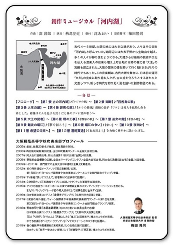 ★★2/28 新型コロナウィルス感染症 感染拡大防止に伴い、 公演は中止となりました。★★ 〜〜〜〜〜〜〜〜〜〜 【1部】ミュージカル ♪創作ミュージカル「河内湖」 作曲:高 昌帥 演出:飛鳥左近 原作脚本:梅田 隆司 振付:洋 あおい (洋さんの出演予定はありません。) 【プロローグ】 【第1景 古の河内湖】 ♪クジラの唄〜 【第2景 湖畔】 ♪百舌鳥の歌〜 【第3景 大王の館】〜 【第4景 匠衆の館】 ♪オラの爺様〜 【第5景 大王の使者】〜 【第6景 堤の工事】 ♪瓢箪の歌〜 【第7景 巫女の館】 ♪恨み歌〜 【第8景 難波の堀江】 ♪夢を創ろう〜 【第9景 堀江の争い】 ♪争い〜 【第10景 夜明け】〜 【第11景 希望の未来へ】〜 【第12景 運河貫通】 ♪おお川よ! 【2部】3年間の歩み ♪交響曲第5番 ♪ミュージカル「レ・ミゼラブル」ハイライト ♪甲子園応援メドレー 他 |